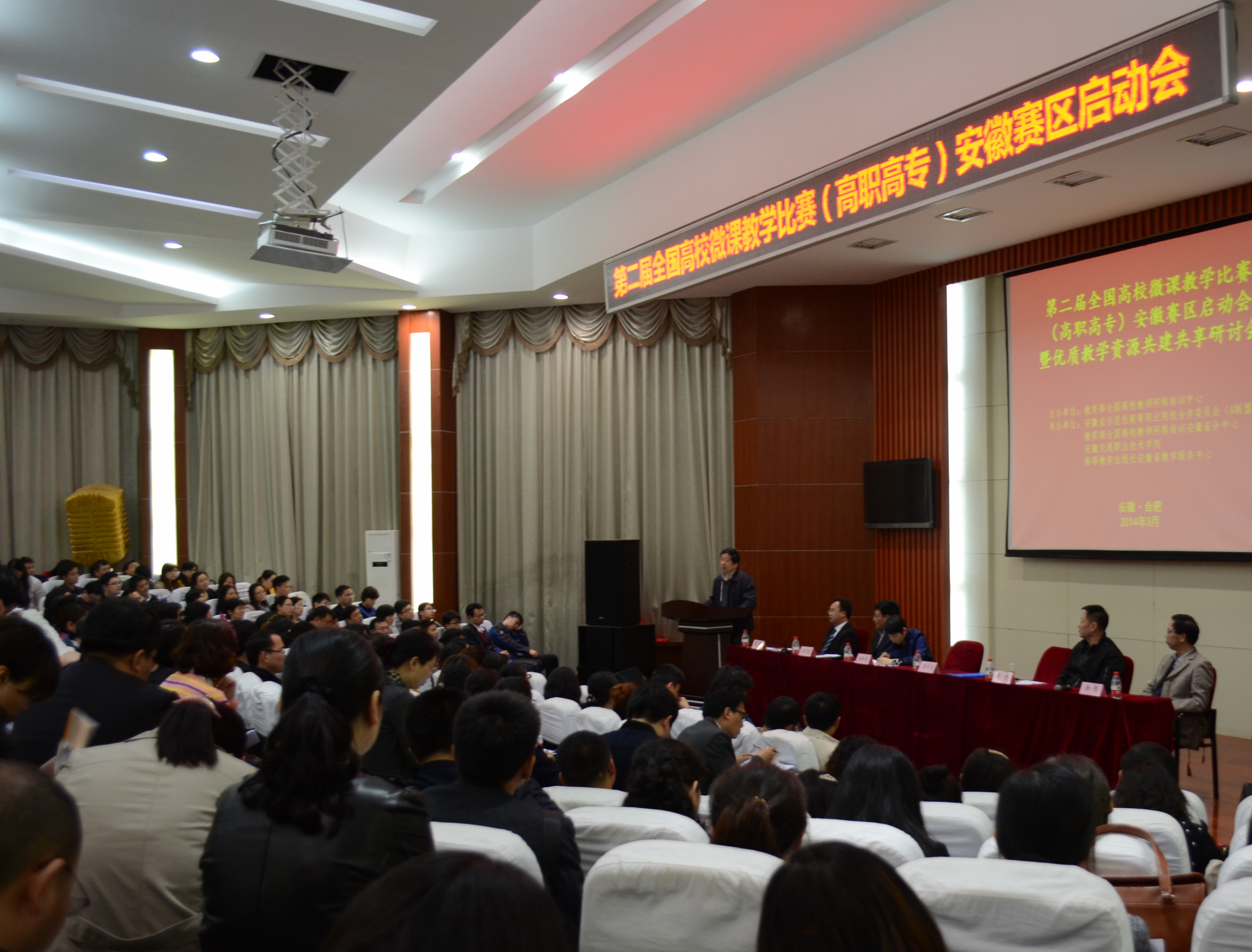 2014年3月21日和3月29日,我院教务处分别组织了13名和8名教研室主任及骨干教师代表先后参加了“安徽省2014年高职教育MOOC时代的教学创新模式研讨会”和“安徽省第二届全国高校微课教学比赛(高职高专)安徽赛区启动会暨优质教学资源共建共享研讨会”。教务处处长蒋腊芳也分别来到会议现场,聆听会议精神。